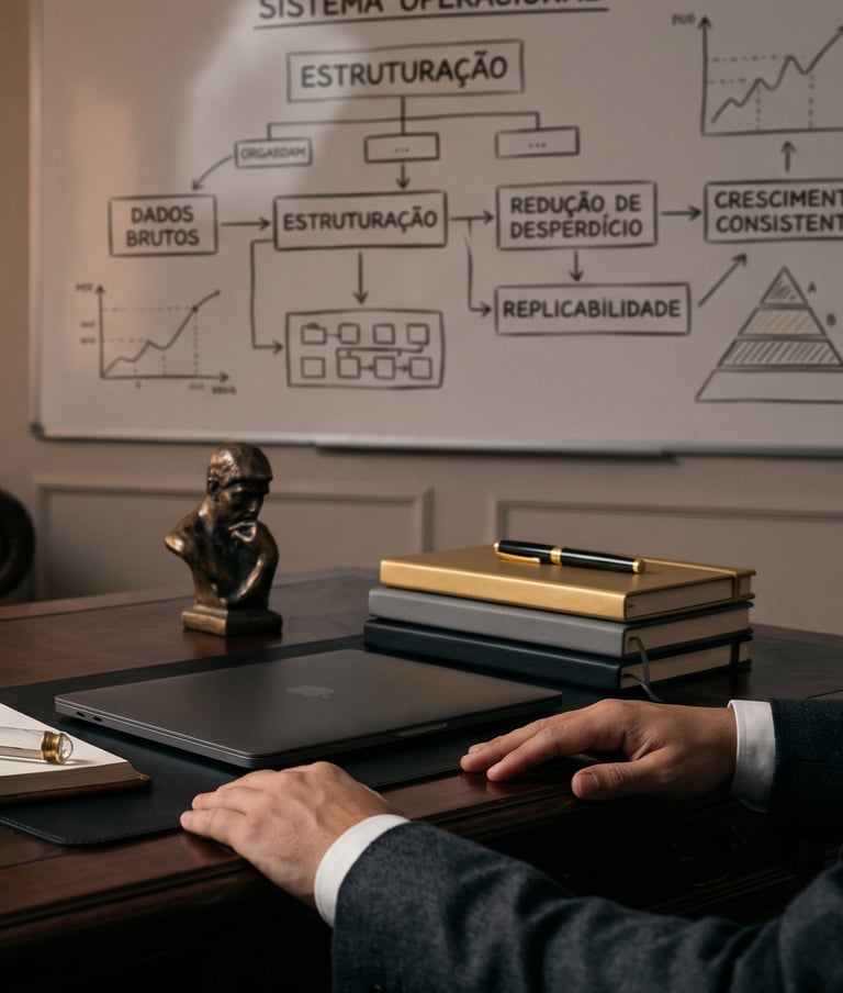 Organizamos o caos operacional da sua empresa através de processos claros e ferramentas simples de gestão. Substituímos o desgaste de quem vive apagando incêndios por um sistema eficiente focado em expansão e resultados sustentáveis.